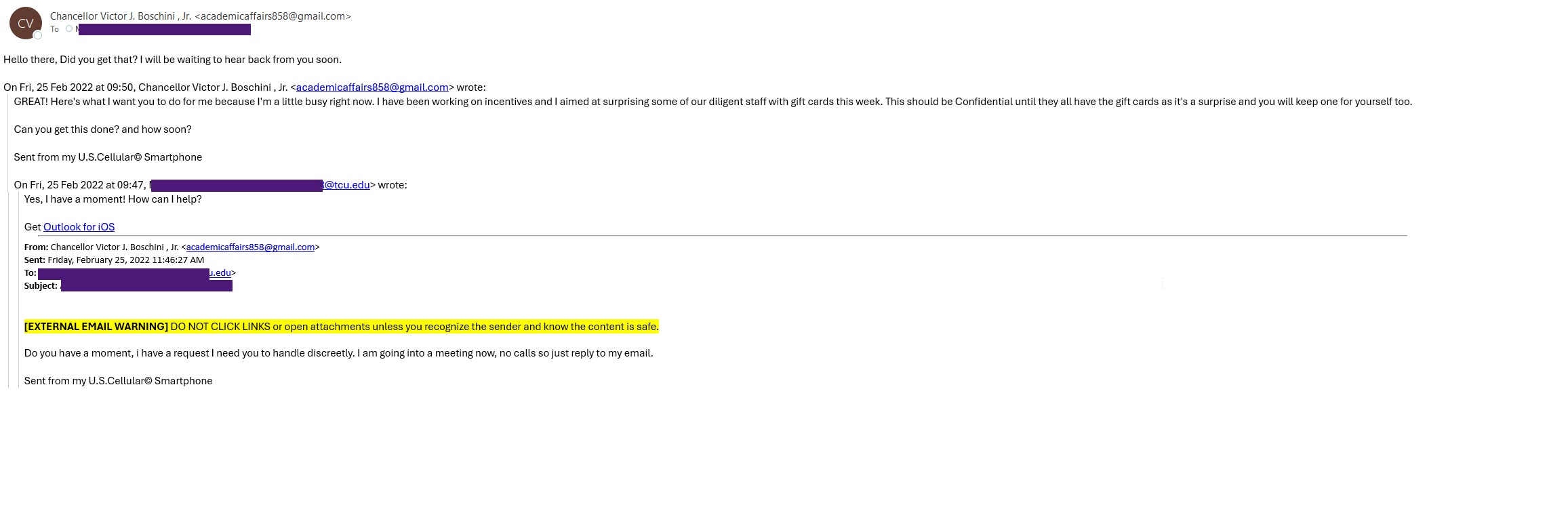 - Gift card requests from someone posing as a supervisor, promising reimbursement.